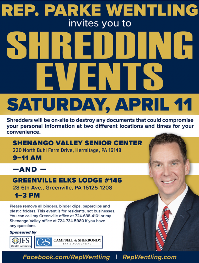 Shredding Event Post author By hempfieldtwpadmin Post date February 19, 2026 Categories In news Representative Parke Wentling invites you to Shredding Events Saturday. April 11th. Click Here for Flyer
